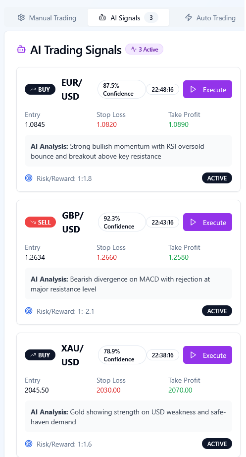 Tak wygląda AI które działa na aplikacji system wybiera trzy instrumenty analizuję je pod względem skuteczności pod instrumentem mamy analizę daną typowo techniczną i gdy ustawiamy sobie w "manual trading" lub "auto trading" ryzo i klikniemy przycisk fioletowy "execute" odrazu otworzy nam się pozycja .